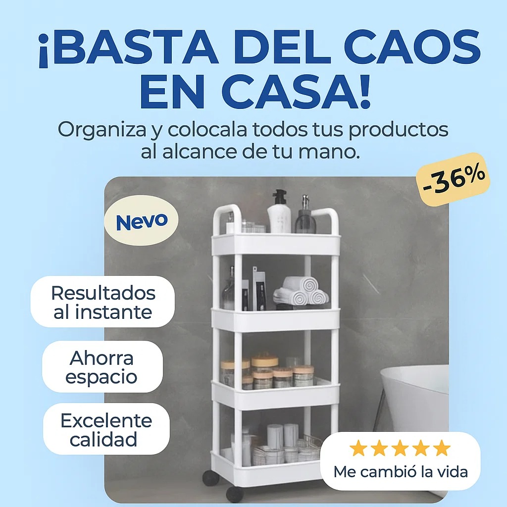 ¿Falta de espacio en baño, cocina u oficina? Organiza+Pro 360 te ayuda a mantener todo en su lugar con estilo y practicidad. Su diseño vertical de 4 niveles y ruedas giratorias 360° permiten moverlo fácil y aprovechar cada rincón de tu hogar.